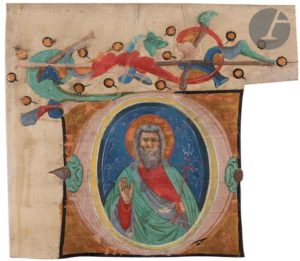 Parchemin contrecollé sur un support cartonné. Traces d’écriture au dos perceptible. Encre et gouache, or bruni. Quelques manques à l’or bruni, petits frottements ou abrasions à la barbe du saint et au décor marginal.