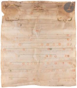 En français, document sur parchemin, avec armoiries peintes (taches et accidents, encre et couleurs pâles).