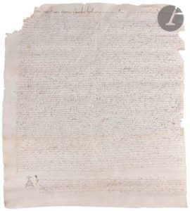 En latin, acte sur parchemin, grand parchemin avec accidents dans la partie supérieure avec manques.