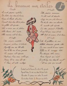 127 pp. contenant 113 chansons très joliment illustrées par des dessins à l’encre et en couleurs, avec table des matières. Reliure de pleine toile beige portant la mention de l’auteur (?) du recueil « Henri Lévêque » sur le premier plat. Quelques salissures et fragilité au dos.
