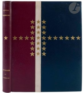 Articles et conférences tapuscrits, notes à l’encre et au crayon à mine. Ensemble relié. In-4, reliure en maroquin tricolore ornée d’étoiles dorées, dos lisse, doublure de soie bleue, tête dorée, chemise et étui (Marot-Rodde).