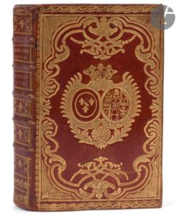Bel exemplaire décoré d’une rare plaque de Pierre-Paul Dubuisson (17..-vers 1762), décrite par Rahir sous le n° 184g (Livres dans de riches reliures, Paris 1910), aux armes de Marie-Fortunée d’Este (1731-1803), princesse de Conti, épouse de Louis-François-Joseph de Bourbon-Conti, comte de la Marche.