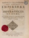 - LE MENESTRIER (Jean Baptiste). Medales illustrées des anciens empereurs et impératrices de Rome. Dijon : Pierre Palliot, 1642. — In-4, 217 x 173 : (4 ff.), 155 pp. mal chiffrées 153. Parchemin souple, dos lisse (reliure de l’époque).