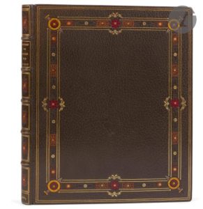 Paris : H. Launette, 1883. — In-4, 277 x 225 : (3 ff.), 8 pp., (1 f.), pp. 9-224, (8 ff.). Maroquin gris anthracite, encadrement de filets dorés, de cercles dorés et de motifs mosaïqués de maroquins rouges, ocre, marron, bordeaux et havane sur les plats, dos à nerfs orné de motifs dorés et mosaïqués, filets et roulette de grecques dorés à l›intérieur, fleur mosaïquée en maroquin rouge aux angles, tête dorée, non rogné (reliure de l’époque).