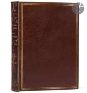 Paris : Alphonse Lemerre, 1893. — In-8, 262 x 180 : (2 ff.), IV, 214 pp., (1 f.), couverture imprimée. Maroquin brun foncé, double filet doré en encadrement sur les plats, dos lisse orné de motifs dorés et mosaïqués de maroquins vert foncé et rouge, dentelle dorée en encadrement à l’intérieur, doublures et gardes de soie moirée bronze, doubles gardes, tête dorée, non rogné, couverture et dos conservés, étui (Vve Simon).