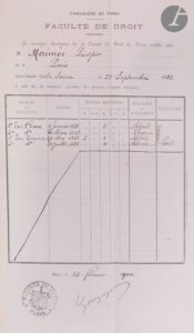 - notes obtenues par Mérimée à ses examens de droit, document émanant de la faculté de droit de Paris, daté du 28 février 1900, une page in-4,