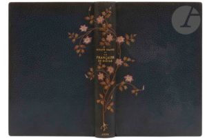 Paris : A. Quantin, 1886. — In-8, 271 x 176 : frontispice, (2 ff.), XVI, 273 pp., (2 ff.), 9 planches, couverture illustrée. Maroquin bleu pétrole, tige d’églantine rose avec fleurs et feuillage mosaïqués dans les tons naturels, décorant le dos et le bord des plats, dos lisse, maroquin bleu pétrole en encadrement à l’intérieur, orné de filets dorés, de feuilles dorées et de fleurs dorées et mosaïquées, doublures et gardes de soie à motifs de cachemire, tranches dorées sur témoins, doubles gardes, couverture et dos conservés (Marius Magnin).
