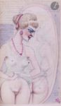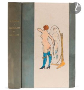 Paris : collection des orties blanches, [1936]. — In-8, 220 x 143 : frontispice, 261 pp., 15 planches, couverture imprimée. Bradel demi-veau bleu gris à bandes, dessin d’une femme nue tenant une cravache devant un miroir sur le premier plat, monogramme du relieur et artiste sur le second plat, dos lisse, non rogné, couverture et dos conservés (Métivier).