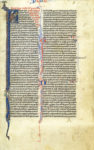 ornées et de très nombreuses initiales filigranées — 604 ff., précédés et suivis de un feuillet de parchemin blanc (gardes), foliotation ancienne perceptible mais rognée un peu court, foliotation moderne au crayon à mine, COMPLET [collation : i-xi24, xii14, xiii-xviii24, xix22, xx26, xxi-xxiii24, xxiv14, xxv-xxvii24], système de signatures alphabétiques A-Z, Aa, Bb, Cc, autre système de numérotation des cahiers dans le coin inférieur gauche des premiers feuillets de chaque cahier, fine écriture gothique fort abrégée, nombreuses corrections ou notes marginales par des mains strictement contemporaines, texte sur deux colonnes, 48 lignes par colonne (justification : 65 x 100 mm), réglure à la mine de plomb, titres courants en capitales alternativement bleues et rouges, rubriques en rouge vif, numérotation des chapitres en rouge et bleu dans la justification du texte, parfois débordant dans les marges, nombreuses initiales peintes en rouge ou bleu, pléthore d’initiales filigranées en rouge ou bleu (certaines initiales sont des initiales « puzzle ») avec décor filigrané bleu pâle ou rouge se prolongeant dans la marge, 83 initiales ornées peintes en bleu et rose foncé avec décor à l’or bruni et entrelacs colorés, hybrides zoomorphes, dragons, serpents, se prolongeant parfois dans la marge, et 2 initiales historiées (ff. 1 et 4v), du même style et palette, dont l’une présente 7 petites miniatures distinctes (7 médaillons quadrilobés et une miniature au pied de l’initiale).