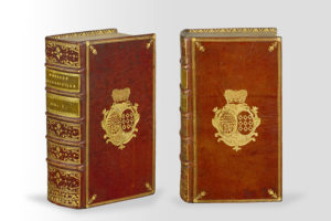 rouge, triple filet doré, petit fleuron aux angles, armoiries au centre, dos orné, pièces de titre et de tomaison olive, roulette intérieure, doublure et gardes de papier dominoté, tranches dorées (Reliure de l'époque).