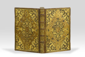 grand cartouche central à motifs d'entrelacs sur fond azuré, avec réserve au milieu contenant les mentions CHARLOTTE (premier plat) et CHARPENTIER (second plat), et grands écoinçons à motifs d'entrelacs et de rinceaux fleuris sur fond azuré, champ des plats couvert d'un semé de fleurs de lis parsemé de gros fers variés, traces de liens, dos orné de filets dorés et d'une répétition de frises d'oves, tranches dorées (Reliure de l'époque).