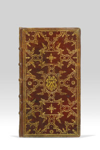 autour d'un médaillon central, lequel est chargé d'armoiries dorées, dos orné d’un vase fleuri répété, roulette intérieure, tranches dorées (Reliure de l'époque).