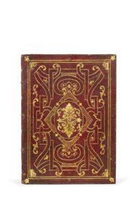 froid et dorés, grande composition de listels imbriqués et d'enroulements dessinés par des filets dorés, parsemée de fleurons ; au centre, médaillon ovale chargé de fleurons accolés et bordé de quatre motifs ornés de pointillés formant losange ; traces de liens, dos orné, tranches dorées (Reliure italienne de l'époque).