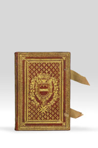 orné au centre de grandes armoiries et chargé d'un semé de fleurs de lis, restes de rubans de soie, dos lisse orné, tranches dorées (Reliure italienne de l'époque).