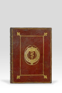 avec fleur de lis répétée aux angles, grandes armoiries au centre, dos orné d'une fleur de lis répétée dans les caissons, roulette intérieure, tranches dorées (Reliure de l'époque).