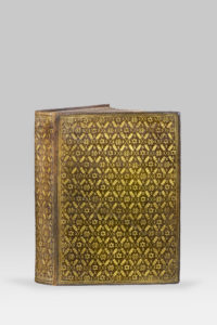 in-4, maroquin fauve, plats et dos lisse entièrement couverts d'un décor à répétition doré, composé d'un pavage losangé dessiné par des filets dorés ponctués de mains de foi ; chaque losange contient un sigle (double Φ ou double Δ) entouré d'S fermés (fermesses), en alternance ; tranches dorées (Reliure de l'époque).