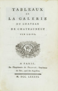 TABLEAUX de la galerie du château de Chateauneuf sur Loire. — Paris, De l'Imprimerie de Prault, 1786. — In-8, maroquin rouge, triple filet doré, emblème (ancre de navire) doré au centre, dos lisse orné, titre doré en long, roulette...