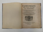[CHARTRES]. CHALLINE de MESSALAIN (Charles). Panegyrique de la ville de Chartres. Prononcé en l’audiance du bailliage à l’eslection des Echevins, le Dimanche xxx. d’Octobre. M. DC. XL. A Paris, Chez la vesve de Guillaume Pelé, 1642....