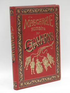 GAVARNI. La Mascarade humaine. Paris, Calmann-Lévy, Éditeur, 1881. In-4°, percaline rouge, titre et large décor doré personnalisé ornant le premier plat (Paul Souze). 60/80 100 compositions humoristiques lithographiées et légendées par...