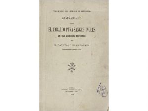 1919. (EQUITCAION). CABANYES, CAYETANO DE: GENERALIDADES SOBRE EL CABALLO PURA-SANGRE INGLES EN SUS DIVERSOS ASPECTOS. Madrid: Imp. de Eduardo Arias. Publicciones del Memoral de artillería, 1919. 4°. 30 p. Rùsitca. DEDICATORIA AUTOGRAFA. no en...