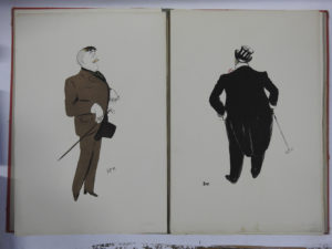 caricatures lithographiées en couleurs, dont sept doubles, la plupart signées. Une planche titrée « Son arrivée… » et une « Armenonville ». Quelques planches légendées au crayon.