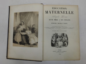 TASTU (Madame Amable). Éducation maternelle. Simples leçons d’une mère à ses enfants. Paris, Didier, Libraire-Éditeur, 1849. In-4°, demi-chagrin noir, dos lisse orné (reliure de l’époque). 40/50 Neuf titres de relais. Un frontispice...
