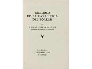 1927. (EQUITACION-TAUROMAQUIA). MESIA DE LA CERDA, PEDRO: DISCURSO DE LA CAVALLERIA DEL TOREAR. Barcelona: Edt. Lux, 1927. 8° menor. 47 p., 4 h. Enc. en media piel, nervios y hierros en el lomo.