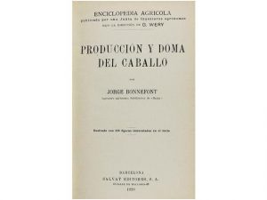 1928. (HIPICA). BONNEFONT, JORGE: PRODUCCION Y DOMA DEL CABALLO. Barcelona: Est. tip. de Salvat Ed., 1928. 8°. 3 h. + 444 p., 2 h. 228 figuras intercaladas en el texto. Enc. tela editorial decorada.
