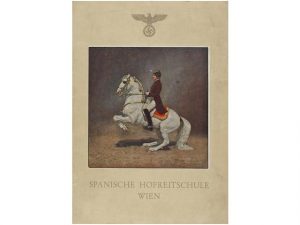 1937 ca. (EQUITACION). ESCUELA ESPANOLA DE EQUITACION DE VIENA (SPANISCHE HOFREIITSCHULE WIEN). Wien/Druck: Elbemühl A.G., sa. 4°. 32 p. Ilustrado con 19 fotograbados. Rústica bellamente ilustrada con un encarte en color y símbolo nazi.