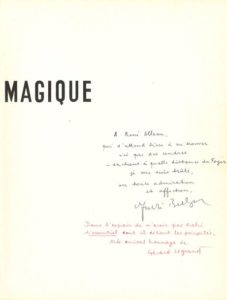 Double envoi autographe signé d'André Breton et Gérard Legrand à René ALLEAU, grand spécialiste des sciences occultes : « A René Alleau, qui s'attend bien à ne trouver rien ici que des cendres - sachant à quelle distance du Foyer je me suis brûlé, en toute admiration et affection, André Breton » - « Dans l'espoir de n'avoir pas trahi l'essentiel dont il détient les précipités, très amical hommage de Gérard Legrand ».