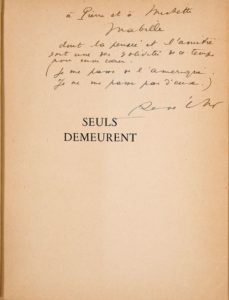 Envoi autographe signé à l'écrivain Pierre MABILLE (1904-1952) et à sa femme : « A Pierre et Michette Mabille dont la pensée et l'amitié sont une des solidités de ce temps pour mon coeur. (Je me passe de l'Amérique. Je ne me passe pas d'eux.) René Char »