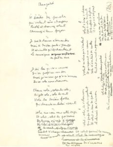Chanson parlée (1 page in-4, Pl. 1355), manuscrit de travail de cette chanson avec ratures et corrections, en 9 quatrains numérotés (8 dans la version publiée, le 9e inédit). « Il y a des paroles / Qui valent des chansons / Parole et chanson volent / Chacune à leur façon »