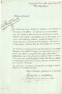 Épinal 17 décembre 1792, au général DUMOURIEZ. Il recommande au « libérateur de la Belgique » et « vengeur de la France » le docteur Guinet « médecin, très instruit, zélé patriote qui pourrait être employé avec succès ». Il lui adresse « un exemplaire d'une autre plaisanterie philosophique, qui a été placardée avec succès à Paris et ailleurs. C'est une parodie de la Déclaration des Droits. Peut-être une affiche de ce genre peut-elle concourir à épurer l'opinion des Peuples, que vous sauvez de l'esclavage » - Paris 21 novembre 1807 : il s'apprête à déménager et veut redevenir « prêtre de Flore et de Pomone » ; il est chargé de rédiger un tableau « de l'état de la langue et de la littérature française depuis 1789 » et voudrait consulter à ce sujet « un petit volume d'Entretiens de Balzac ». - 7 août 1819, à Alexandre PETITOT, au sujet de L'Esprit de Corneille dont l'unique exemplaire a été envoyé à l'Académie ; il est en convalescence et ne lit aucun journal ; il ne veut plus voyager, pour profiter de ses derniers jours : « le meilleur moyen [] c'est de vivre avec l'amitié, et comme Candide, de cultiver son jardin » - 1er janvier 1820, à François RAYNOUARD, secrétaire perpétuel de l'Académie française : il envoie en étrennes « une belle édition de Gil Blas, avec des notes qui contiennent la clé du roman » ; des estampes suivront - 20 juillet 1824, à Népomucène LEMERCIER, le félicitant de son drame, Richard III et Jeanne Shore, qu'il a lu, sa goutte l'empêchant d'aller au spectacle : « en lisant les bonnes pièces, je crois encore y assister ». Il fait quelques remarques de style, et se montre pointilleux envers le travail de l'imprimeur car la typographie laisse à désirer Il lui reproche d'en faire un peu trop : « la duplicité des tons peut-elle autoriser la duplicité des sujets ? N'aviez vous pas assez à peindre de l'effigie affreuse de ce coquin de Richard Trois ? [] vous aimez à créer des monstres []. Cependant j'aurais préféré Richard trois, seul et pur ; mais avec moins de monologues. Corneille se plaint d'avoir sacrifié, dans ses premières pièces, à cette manie des acteurs, qui, de son temps aussi, ne voulaient que des soliloques. L'essence de l'art dramatique est pourtant dans le dialogue »