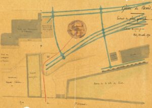 Extrait du plan général de la Gare de Paris (Gare du Nord), sur calque, à l'encre et aquarelle, à l'échelle 0,002, daté du 24 octobre 1870. Le plan, coupé en deux morceaux (28,5 x 20,5 cm chaque)., montre les différents emplacements des zones de construction des ballons et ceux réservés à l'administration.