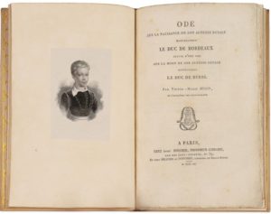 Ode sur la naissance de Son Altesse Royale Monseigneur le duc de Bordeaux, suivie d'une Ode sur la mort de Son Altesse Royale Monseigneur le duc de Berri (Paris, Boucher, Pélicier et Ponthieu, 1820) ; in-8, maroquin crème, dos à nerfs, encadrement intérieur de fleurs de lys dorées et d'un listel de maroquin bleu, doublures et gardes de soie beige, tranches dorées (Marius Michel).