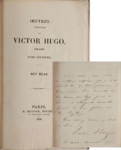 Cet exemplaire est enrichi de 2 billets autographes signés de Victor Hugo (1 p. in-12 chaque). - 31 mars [1846, à Antony BÉRAUD, directeur de l'Ambigu ?], demandant une loge pour Les Mousquetaires, « à charge de revanche quand il vous plaira de voir Ruy Blas ». - Samedi minuit ½, [à Frédérick LEMAÎTRE, créateur du rôle de Ruy Blas] : « Vous avez été sublime ».