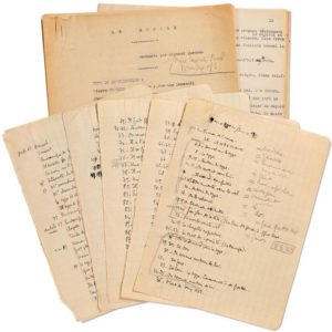On joint le tapuscrit corrigé d'un autre scénario, Le Retard (23 pages in-4), inédit et jamais tourné, probablement de la fin des années trente. Queneau prévoyait une distribution prestigieuse : Pierre Brasseur, Jean Tissier, Jacques Dumesnil, Marie Déa, Annie Ducaux... L'action se déroule au Havre, la ville natale de Queneau. Plus le dossier d'un scénario original inédit, Tête de sons, [1946] : notes autographes (1 p. in-4)et 2 tapuscrits corrigés (3 et 8 p. in-4).