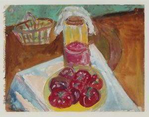 AQUARELLE gouachée, Nature morte aux tomates ; 24 x 31 cm.