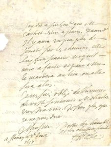 Les lettres de Mme de Vendôme et de M. Matarel ont été rendues à Son Éminence, mais Rose ne peut dire la réponse, seulement « asseurer que jay rendu a M. Matarel tout le bon office quil mestoit possible ; ce qui luy servit de reponse a mon egard. Avec vostre permission ne pouvant écrire qu'avec peine dans mon incommodité, jay dit a son Emce que M. Cartret seroit a Paris. Quand il y aura un peu plus de seureté sur les chemins, elle luy fera scavoir ce quil aura a faire et peut-estre le mandera au lieu ou elle sera alors »