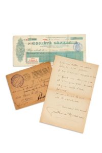 On joint ce chèque de 3 francs, sur la Société Générale, signé par Laboureur à l'ordre de Guillaume Apollinaire en date du 13 novembre 1916 (déchiré et recollé).