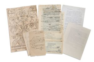 On joint un dessin de décoration plume et lavis (début XVIIIe s.) ; un recueil de gravures de Charles-Michel CAMPION (rel. basane brune) avec envoi de Campion à M. Bretonneau (1779) ; un album de dessins romantiques ; une gravure d'après Flaxman ; plus la copie d'une lettre d'Ingres à Vernet, et la transcription dactyl. d'une lettre de Kandinsky.