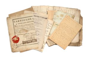 Dossier de 15 lettres et documents concernant l'ingénieur géographe Jacques PARSON, 1773 - 1818, dont une lettre d'un cousin de La Trinité (Martinique) en 1773, et 3 documents de la Société Coloniale Africaine (commission déléguée au Cap Vert, 1815)...