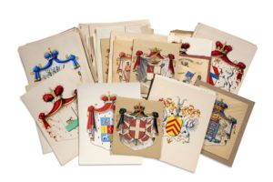 Bel ensemble d'armoiries dessinées, certaines portant au dos le cachet du maître-héraldiste AGRY. Familles ou maisons françaises ou étran­gères : Bade, Bavière, Beauvau, Bentinck, Bismarck, Bulow, Castelbajac, Choiseul-Praslin, Clauzel, Clermont-Tonnerre, Comnène, Contades, Diesbach, Dolgorouki, Este, Fugger, Galliffet, Ganay, Goulaine, Hénin, Hesse, Isenburg-Birstein, La Force, Las Cases, Lauriston, Leuchtenberg, Massimo, Moltke, Montesquiou-Fezensac, Mortemart, Narbonne-Lara, Polignac, Pozzo di Borgo, Prusse, Rohan, Russie, Saxe, Ségur, Strozzi, Talleyrand, etc.