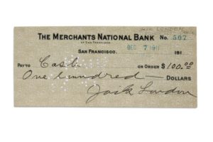 LONDON Jack (1876 - 1916) Chèque bancaire autographe signé «Jack London», 7 décembre 1911 ; 1 …