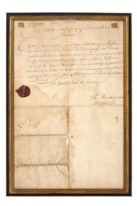 On joint une P.S. par le maréchal de CRÉQUY, Philippeville 18 mars 1675, certificat pour le S. de Ramsoux (demi-page in-fol., cachet de cire rouge ; taches, encadrée).