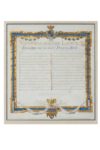 Élégante calligraphie dans un bel encadrement peint aux armes du Dauphin Louis. Chant funèbre en 28 vers à la mémoire du Dauphin Louis de France (1729 - 1765), père de Louis XVI, et neuvième Dauphin de France portant le nom de Louis. Collet signe comme «Chevalier et Secrétaire de l'ordre du Roi, Secrétaire des commandemens de Madame l'Infante et Censeur royal» ; il s'agit de Louis-Jean-François COLLET (1722 - 1787).