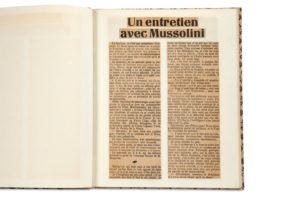 Le manuscrit est relié avec cinq coupures de presse de journaux français sur le Duce : Jean Fayard, «Un entretien avec Mussolini» (Candide, 24 février 1927) ; Léon Daudet, compte rendu du livre de Mussolini Le Fascisme (Candide, 6 juillet 1933), et des OEuvres et discours de Mussolini (Candide, 14 mars 1935) ; Jacques Bainville, «Un mot de Mussolini» (L'Action française, 14 janvier 1933) et «Mussolini et l'exemple de Sylla» (L'Action française, 5 janvier 1925).