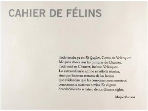 Fojch. 107 p., 1 h. Ilustr. con reproducciones de las primeras fotografias de las cuevas, descubiertas en 1994. Libro CAHIER DE FÉLINS contiene los 37 dibujos reproducidos en facsimil a partir de los originales de Barceló. Ambos enc. en tela edit. estampada. Acompana la obra una lamina numerada. Lleva ademas, un texto de Barceló en gran folio en papel translúcido de gramaje alto. Edición numerada y firmada a lapiz por el autor de un total de 2998 ejemplares. Todo presentado en un estuche de madera de arce con un pirograbado del propio M. Barceló.