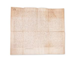ARCHIVES XIVe - [Franche-Comté] Bail rédigé à la cour de Besançon, en 1374, en faveur de Jehan dit « de Chambornay de Montferrand, châtelain de Clay ». Paiement du bail à la Saint Etienne. 1 p. gd in-folio (52 x 45,5 cm) sur parchemin. Lettrine ornée.