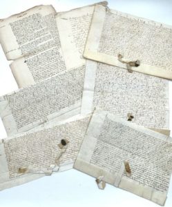 ARCHIVES XVe Bel ensemble de 9 chartes datées de 1406 à 1497. Formats divers. 7 documents sur parchemin dont 4 portent des restes de cachet de cire noire, 2 documents sur papier. Documents en bon état.
